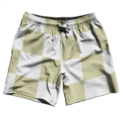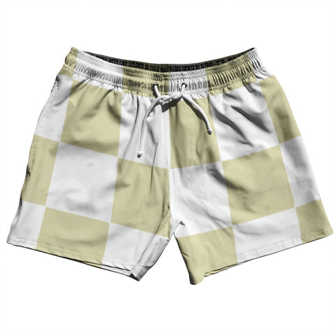 Product Story: Checkerboard 5 Inches Vegas Gold and White 5" Swim Shorts Made in USAProduct Description: Checkerboard 5 Inches Vegas Gold and White 5" Swim Shorts Made in USA 5" Inseam & 17.5" Tall Swim Trunks Board Shorts Bathing Suits Swim Suits Quick Drying Material Stretch Polyester Elastic Waistband Drawstring Side Pockets Made In USA