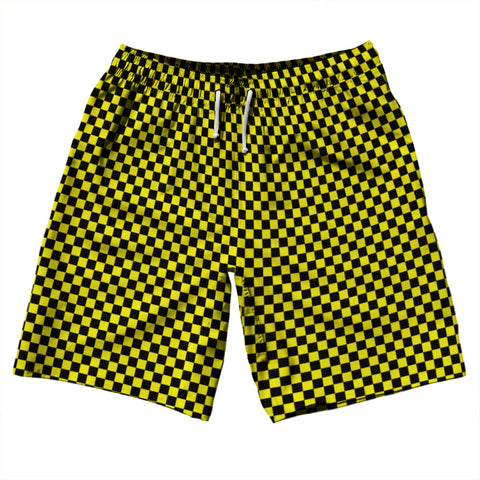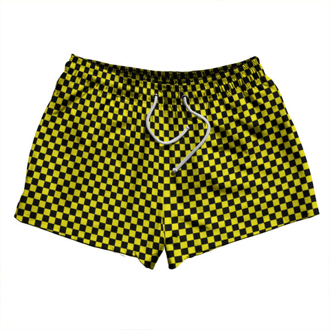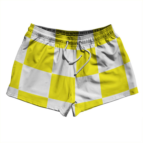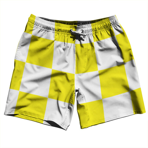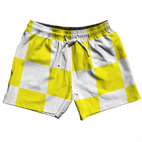 Product Story: Checkerboard 5 Inches Yellow Bright and White 2.5" Swim Shorts Made in USAProduct Description: Checkerboard 5 Inches Yellow Bright and White 2.5" Swim Shorts Made in USA Stripe 2.50" Inseam Swim Shorts Swim Trunks Board Shorts Bathing Suits Swim Suits Quick Drying Material Stretch Polyester Elastic Waistband Drawstring Side Pockets Made In USA