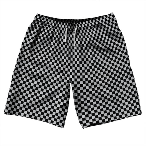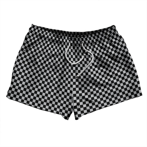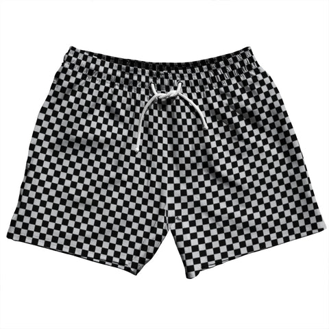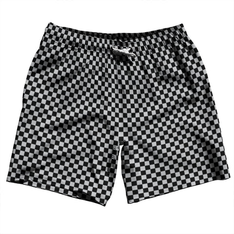 Product Story: Checkerboard Half Inch Black and Grey Medium 2.5" Swim Shorts Made in USAProduct Description: Checkerboard Half Inch Black and Grey Medium 2.5" Swim Shorts Made in USA Stripe 2.50" Inseam Swim Shorts Swim Trunks Board Shorts Bathing Suits Swim Suits Quick Drying Material Stretch Polyester Elastic Waistband Drawstring Side Pockets Made In USA