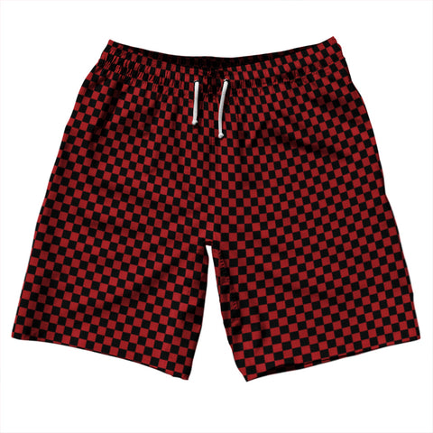 Product Story: Checkerboard Half Inch Black and Red Dark Swim Shorts 7" Made in USAProduct Description: Checkerboard Half Inch Black and Red Dark Swim Shorts 7" Made in USA 7'' Inseam & 20" Tall Swim Trunks Board Shorts Bathing Suits Swim Suits Quick Drying Material Stretch Polyester Elastic Waistband Drawstring Side Pockets Made In USA