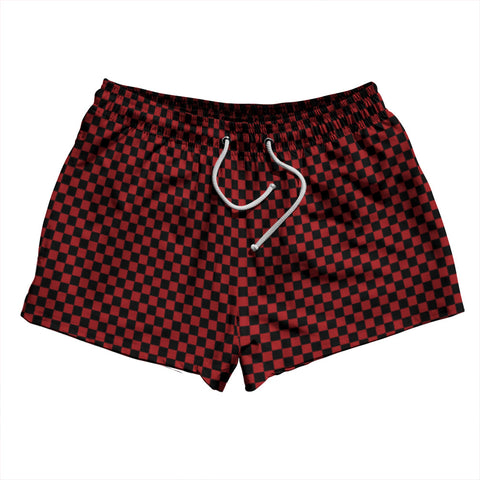 Product Story: Checkerboard Half Inch Black and Red Dark 2.5" Swim Shorts Made in USAProduct Description: Checkerboard Half Inch Black and Red Dark 2.5" Swim Shorts Made in USA Stripe 2.50" Inseam Swim Shorts Swim Trunks Board Shorts Bathing Suits Swim Suits Quick Drying Material Stretch Polyester Elastic Waistband Drawstring Side Pockets Made In USA