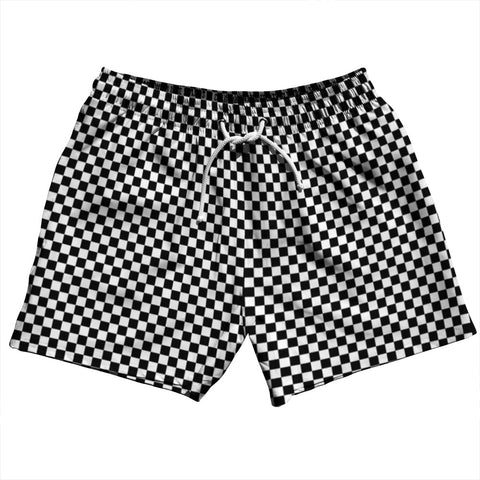 Product Story: Checkerboard Half Inch Black and White 2.5" Swim Shorts Made in USAProduct Description: Checkerboard Half Inch Black and White 2.5" Swim Shorts Made in USA Stripe 2.50" Inseam Swim Shorts Swim Trunks Board Shorts Bathing Suits Swim Suits Quick Drying Material Stretch Polyester Elastic Waistband Drawstring Side Pockets Made In USA