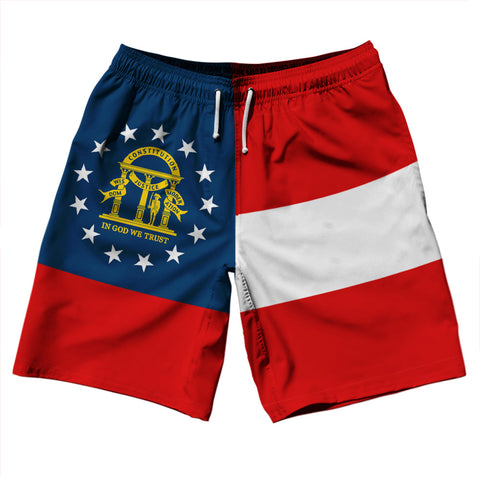 Product Story: Georgia US State Flag 2.5" Swim Shorts Made in USAProduct Description: Georgia US State Flag 2.5" Swim Shorts Made in USA Stripe 10" Inseam Swim Shorts Swim Trunks Board Shorts Bathing Suits Swim Suits Quick Drying Material Stretch Polyester Elastic Waistband Drawstring Side Pockets Made In USA