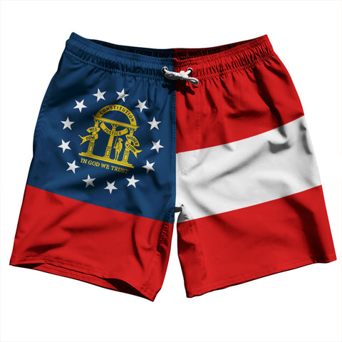 Product Story: Georgia US State Flag 5" Swim Shorts Made in USAProduct Description: Georgia US State Flag 5" Swim Shorts Made in USA Stripe 10" Inseam Swim Shorts Swim Trunks Board Shorts Bathing Suits Swim Suits Quick Drying Material Stretch Polyester Elastic Waistband Drawstring Side Pockets Made In USA