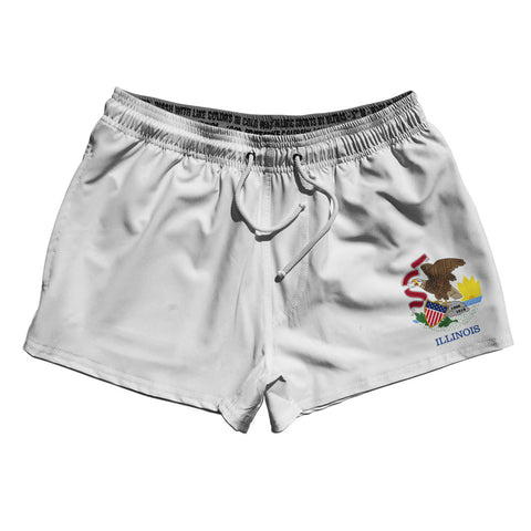 Product Story: Illinois US State Flag Swim Shorts 7" Made in USAProduct Description: Illinois US State Flag Swim Shorts 7" Made in USA 5" Inseam & 17.5" Tall Swim Trunks Board Shorts Bathing Suits Swim Suits Quick Drying Material Stretch Polyester Elastic Waistband Drawstring Side Pockets Made In USA