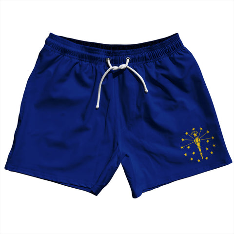 Product Story: Indiana US State Flag 5" Swim Shorts Made in USAProduct Description: Indiana US State Flag 5" Swim Shorts Made in USA 5" Inseam & 17.5" Tall Swim Trunks Board Shorts Bathing Suits Swim Suits Quick Drying Material Stretch Polyester Elastic Waistband Drawstring Side Pockets Made In USA