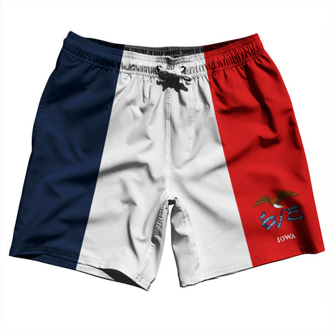 Product Story: Iowa US State Flag Swim Shorts 7" Made in USAProduct Description: Iowa US State Flag Swim Shorts 7" Made in USA Stripe 2.50" Inseam Swim Shorts Swim Trunks Board Shorts Bathing Suits Swim Suits Quick Drying Material Stretch Polyester Elastic Waistband Drawstring Side Pockets Made In USA