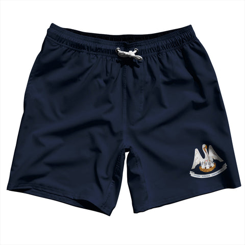 Product Story: Louisiana US State Flag Swim Shorts 7" Made in USAProduct Description: Louisiana US State Flag Swim Shorts 7" Made in USA Stripe 2.50" Inseam Swim Shorts Swim Trunks Board Shorts Bathing Suits Swim Suits Quick Drying Material Stretch Polyester Elastic Waistband Drawstring Side Pockets Made In USA
