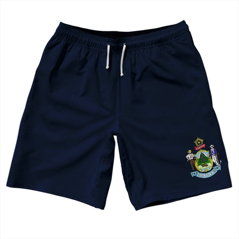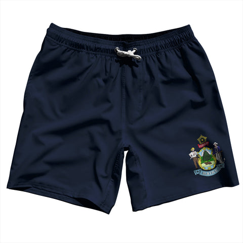 Product Story: Maine US State Flag Swim Shorts 7" Made in USAProduct Description: Maine US State Flag Swim Shorts 7" Made in USA 5" Inseam & 17.5" Tall Swim Trunks Board Shorts Bathing Suits Swim Suits Quick Drying Material Stretch Polyester Elastic Waistband Drawstring Side Pockets Made In USA