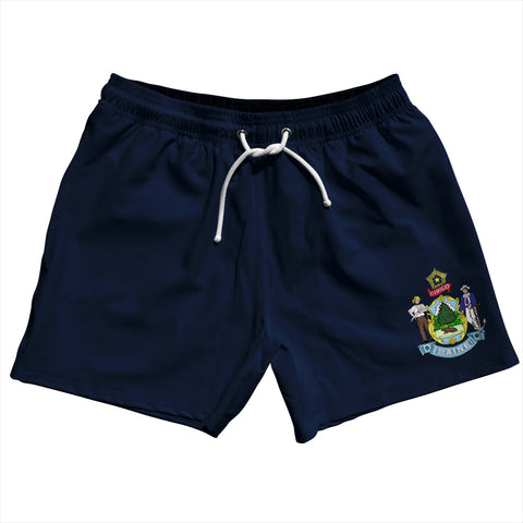 Product Story: Maine US State Flag 5" Swim Shorts Made in USAProduct Description: Maine US State Flag 5" Swim Shorts Made in USA Stripe 2.50" Inseam Swim Shorts Swim Trunks Board Shorts Bathing Suits Swim Suits Quick Drying Material Stretch Polyester Elastic Waistband Drawstring Side Pockets Made In USA