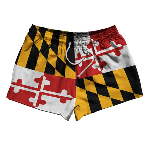 Product Story: Maryland US State Flag 2.5" Swim Shorts Made in USAProduct Description: Maryland US State Flag 2.5" Swim Shorts Made in USA Stripe 2.50" Inseam Swim Shorts Swim Trunks Board Shorts Bathing Suits Swim Suits Quick Drying Material Stretch Polyester Elastic Waistband Drawstring Side Pockets Made In USA