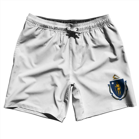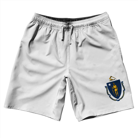 Product Story: Massachusetts US State Flag Swim Shorts 7" Made in USAProduct Description: Massachusetts US State Flag Swim Shorts 7" Made in USA Stripe 2.50" Inseam Swim Shorts Swim Trunks Board Shorts Bathing Suits Swim Suits Quick Drying Material Stretch Polyester Elastic Waistband Drawstring Side Pockets Made In USA