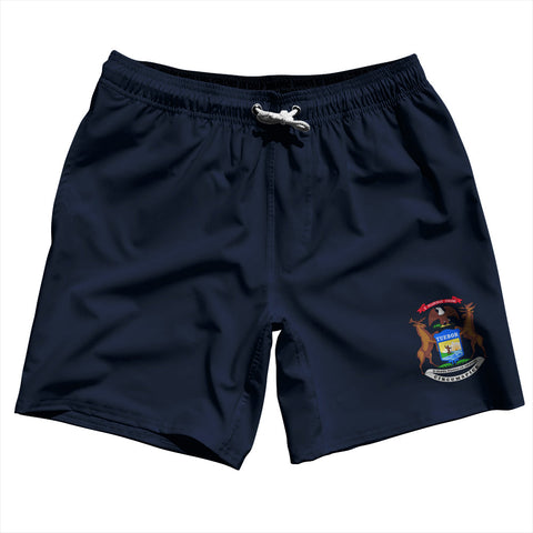 Product Story: Michigan US State Flag Swim Shorts 7" Made in USAProduct Description: Michigan US State Flag Swim Shorts 7" Made in USA 5" Inseam & 17.5" Tall Swim Trunks Board Shorts Bathing Suits Swim Suits Quick Drying Material Stretch Polyester Elastic Waistband Drawstring Side Pockets Made In USA