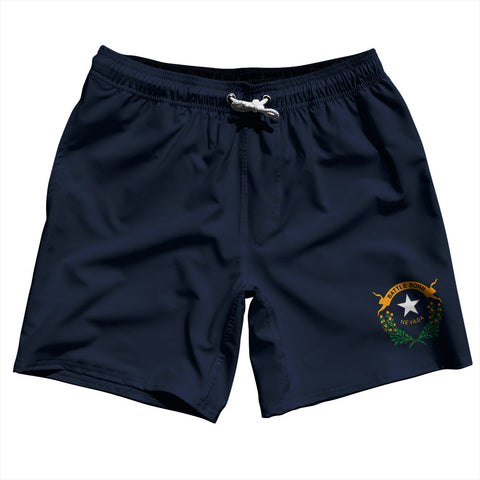 Product Story: Nevada US State Flag Swim Shorts 7" Made in USAProduct Description: Nevada US State Flag Swim Shorts 7" Made in USA 5" Inseam & 17.5" Tall Swim Trunks Board Shorts Bathing Suits Swim Suits Quick Drying Material Stretch Polyester Elastic Waistband Drawstring Side Pockets Made In USA