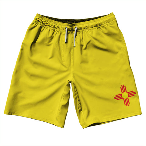 Product Story: New Mexico US State Flag 5" Swim Shorts Made in USAProduct Description: New Mexico US State Flag 5" Swim Shorts Made in USA Stripe 2.50" Inseam Swim Shorts Swim Trunks Board Shorts Bathing Suits Swim Suits Quick Drying Material Stretch Polyester Elastic Waistband Drawstring Side Pockets Made In USA