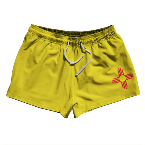 Product Story: New Mexico US State Flag 2.5" Swim Shorts Made in USAProduct Description: New Mexico US State Flag 2.5" Swim Shorts Made in USA 7'' Inseam & 20" Tall Swim Trunks Board Shorts Bathing Suits Swim Suits Quick Drying Material Stretch Polyester Elastic Waistband Drawstring Side Pockets Made In USA