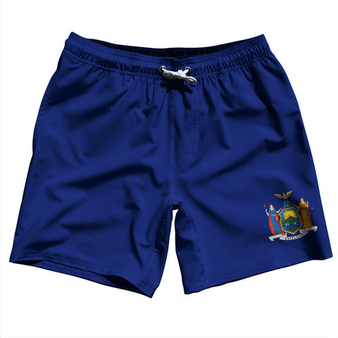 Product Story: New York US State Flag Swim Shorts 7" Made in USAProduct Description: New York US State Flag Swim Shorts 7" Made in USA 7'' Inseam & 20" Tall Swim Trunks Board Shorts Bathing Suits Swim Suits Quick Drying Material Stretch Polyester Elastic Waistband Drawstring Side Pockets Made In USA