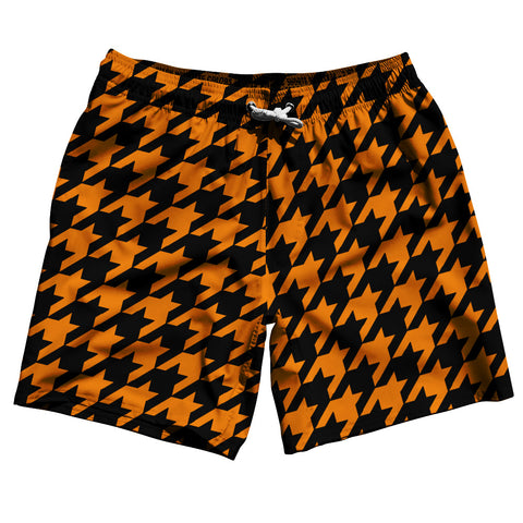 Product Story: Orange Tennessee And Black Houndstooth Swim Shorts 7" Made In USAProduct Description: Orange Tennessee And Black Houndstooth Swim Shorts 7" Made In USA 7'' Inseam & 20" Tall Swim Trunks Board Shorts Bathing Suits Swim Suits Quick Drying Material Stretch Polyester Elastic Waistband Drawstring Side Pockets Made In USA