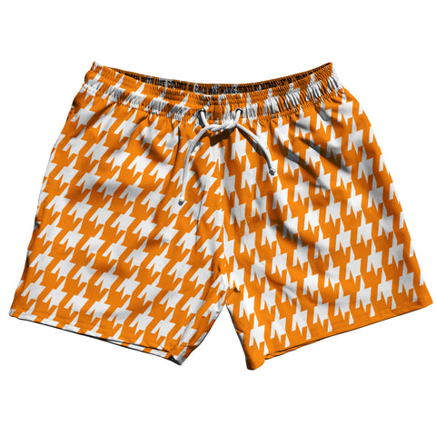 Product Story: Orange Tennessee And White Houndstooth 5" Swim Shorts Made In USAProduct Description: Orange Tennessee And White Houndstooth 5" Swim Shorts Made In USA 5" Inseam & 17.5" Tall Swim Trunks Board Shorts Bathing Suits Swim Suits Quick Drying Material Stretch Polyester Elastic Waistband Drawstring Side Pockets Made In USA