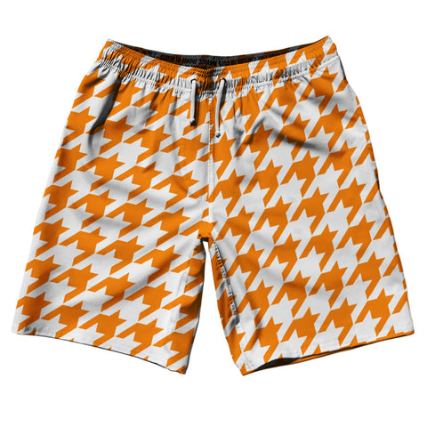 Product Story: Orange Tennessee And White Houndstooth Swim Shorts 7" Made In USAProduct Description: Orange Tennessee And White Houndstooth Swim Shorts 7" Made In USA 7'' Inseam & 20" Tall Swim Trunks Board Shorts Bathing Suits Swim Suits Quick Drying Material Stretch Polyester Elastic Waistband Drawstring Side Pockets Made In USA