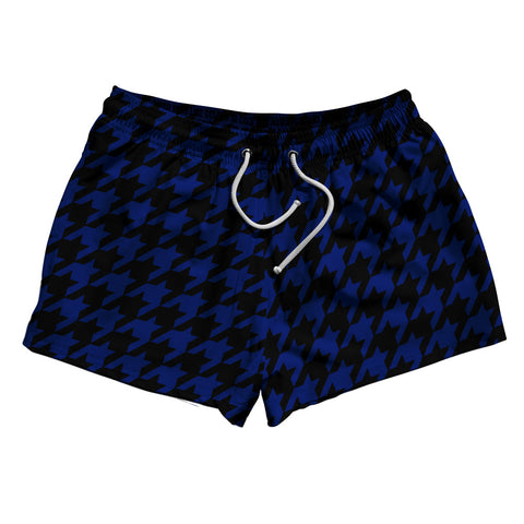 Product Story: Blue Royal And Black Houndstooth 2.5" Swim Shorts Made In USAProduct Description: Blue Royal And Black Houndstooth 2.5" Swim Shorts Made In USA Stripe 2.50" Inseam Swim Shorts Swim Trunks Board Shorts Bathing Suits Swim Suits Quick Drying Material Stretch Polyester Elastic Waistband Drawstring Side Pockets Made In USA