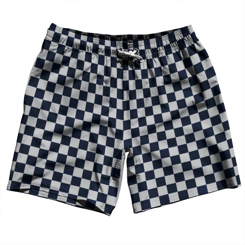 Product Story: Checkerboard 1 Inch Blue Navy And Grey Medium Swim Shorts 7" Made in USAProduct Description: Checkerboard 1 Inch Blue Navy And Grey Medium Swim Shorts 7" Made in USA 7'' Inseam & 20" Tall Swim Trunks Board Shorts Bathing Suits Swim Suits Quick Drying Material Stretch Polyester Elastic Waistband Drawstring Side Pockets Made In USA