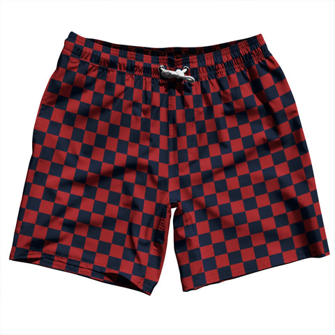 Product Story: Checkerboard 1 Inch Blue Navy and Red Dark Swim Shorts 7" Made in USAProduct Description: Checkerboard 1 Inch Blue Navy and Red Dark Swim Shorts 7" Made in USA 7'' Inseam & 20" Tall Swim Trunks Board Shorts Bathing Suits Swim Suits Quick Drying Material Stretch Polyester Elastic Waistband Drawstring Side Pockets Made In USA
