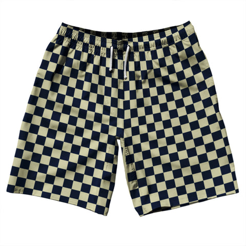 Product Story: Checkerboard 1 Inch Blue Navy and Vegas Gold Swim Shorts 7" Made in USAProduct Description: Checkerboard 1 Inch Blue Navy and Vegas Gold Swim Shorts 7" Made in USA 7'' Inseam & 20" Tall Swim Trunks Board Shorts Bathing Suits Swim Suits Quick Drying Material Stretch Polyester Elastic Waistband Drawstring Side Pockets Made In USA