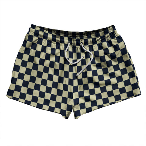 Product Story: Checkerboard 1 Inch Blue Navy and Vegas Gold 2.5" Swim Shorts Made in USAProduct Description: Checkerboard 1 Inch Blue Navy and Vegas Gold 2.5" Swim Shorts Made in USA Stripe 2.50" Inseam Swim Shorts Swim Trunks Board Shorts Bathing Suits Swim Suits Quick Drying Material Stretch Polyester Elastic Waistband Drawstring Side Pockets Made In USA