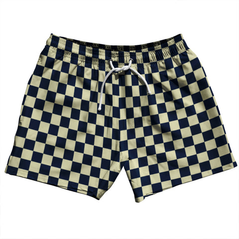 Product Story: Checkerboard 1 Inch Blue Navy and Vegas Gold 5" Swim Shorts Made in USAProduct Description: Checkerboard 1 Inch Blue Navy and Vegas Gold 5" Swim Shorts Made in USA 5" Inseam & 17.5" Tall Swim Trunks Board Shorts Bathing Suits Swim Suits Quick Drying Material Stretch Polyester Elastic Waistband Drawstring Side Pockets Made In USA