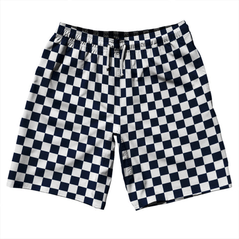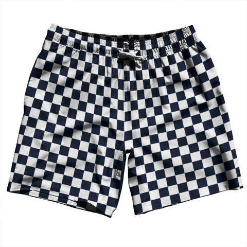 Product Story: Checkerboard 1 Inch Blue Navy and White Swim Shorts 7" Made in USAProduct Description: Checkerboard 1 Inch Blue Navy and White Swim Shorts 7" Made in USA 7'' Inseam & 20" Tall Swim Trunks Board Shorts Bathing Suits Swim Suits Quick Drying Material Stretch Polyester Elastic Waistband Drawstring Side Pockets Made In USA