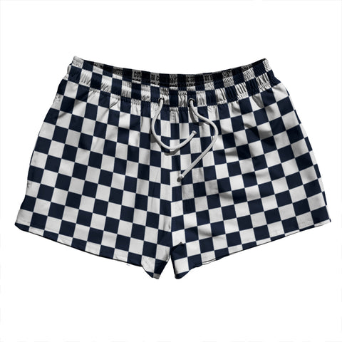 Product Story: Checkerboard 1 Inch Blue Navy and White 2.5" Swim Shorts Made in USAProduct Description: Checkerboard 1 Inch Blue Navy and White 2.5" Swim Shorts Made in USA Stripe 2.50" Inseam Swim Shorts Swim Trunks Board Shorts Bathing Suits Swim Suits Quick Drying Material Stretch Polyester Elastic Waistband Drawstring Side Pockets Made In USA