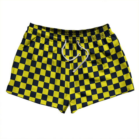 Product Story: Checkerboard 1 Inch Blue Navy and Yellow Canary 2.5" Swim Shorts Made in USAProduct Description: Checkerboard 1 Inch Blue Navy and Yellow Canary 2.5" Swim Shorts Made in USA Stripe 2.50" Inseam Swim Shorts Swim Trunks Board Shorts Bathing Suits Swim Suits Quick Drying Material Stretch Polyester Elastic Waistband Drawstring Side Pockets Made In USA