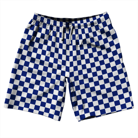 Product Story: Checkerboard 1 Inch Blue Royal and White 2.5" Swim Shorts Made in USAProduct Description: Checkerboard 1 Inch Blue Royal and White 2.5" Swim Shorts Made in USA Stripe 2.50" Inseam Swim Shorts Swim Trunks Board Shorts Bathing Suits Swim Suits Quick Drying Material Stretch Polyester Elastic Waistband Drawstring Side Pockets Made In USA