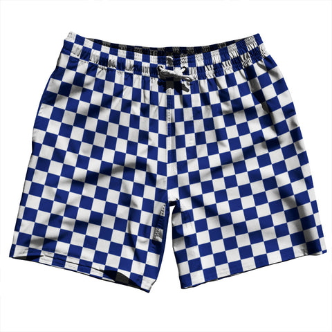 Product Story: Checkerboard 1 Inch Blue Royal and White Swim Shorts 7" Made in USAProduct Description: Checkerboard 1 Inch Blue Royal and White Swim Shorts 7" Made in USA 7'' Inseam & 20" Tall Swim Trunks Board Shorts Bathing Suits Swim Suits Quick Drying Material Stretch Polyester Elastic Waistband Drawstring Side Pockets Made In USA