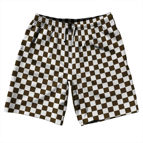 Product Story: Checkerboard 1 Inch Brown Dark and White Swim Shorts 7" Made in USAProduct Description: Checkerboard 1 Inch Brown Dark and White Swim Shorts 7" Made in USA 7'' Inseam & 20" Tall Swim Trunks Board Shorts Bathing Suits Swim Suits Quick Drying Material Stretch Polyester Elastic Waistband Drawstring Side Pockets Made In USA