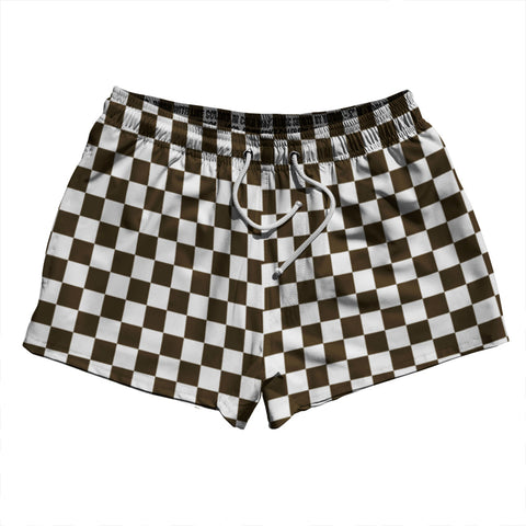 Product Story: Checkerboard 1 Inch Brown Dark and White 2.5" Swim Shorts Made in USAProduct Description: Checkerboard 1 Inch Brown Dark and White 2.5" Swim Shorts Made in USA Stripe 2.50" Inseam Swim Shorts Swim Trunks Board Shorts Bathing Suits Swim Suits Quick Drying Material Stretch Polyester Elastic Waistband Drawstring Side Pockets Made In USA