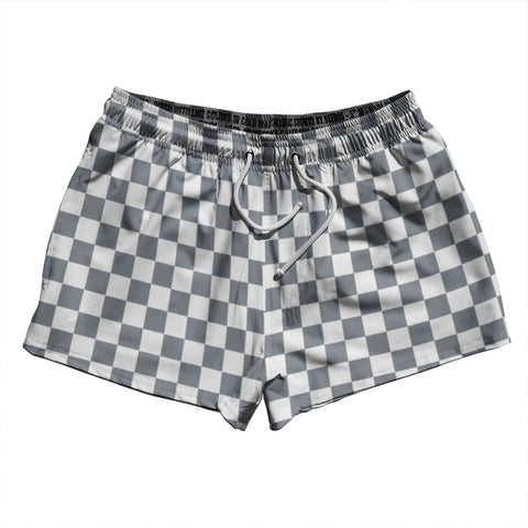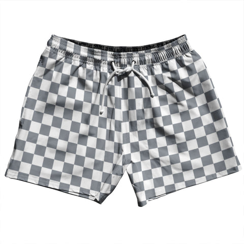Product Story: Checkerboard 1 Inch Grey Dark and White 2.5" Swim Shorts Made in USAProduct Description: Checkerboard 1 Inch Grey Dark and White 2.5" Swim Shorts Made in USA Stripe 2.50" Inseam Swim Shorts Swim Trunks Board Shorts Bathing Suits Swim Suits Quick Drying Material Stretch Polyester Elastic Waistband Drawstring Side Pockets Made In USA