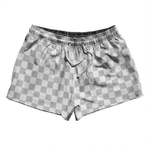 Product Story: Checkerboard 1 Inch Grey Medium and White 2.5" Swim Shorts Made in USAProduct Description: Checkerboard 1 Inch Grey Medium and White 2.5" Swim Shorts Made in USA Stripe 2.50" Inseam Swim Shorts Swim Trunks Board Shorts Bathing Suits Swim Suits Quick Drying Material Stretch Polyester Elastic Waistband Drawstring Side Pockets Made In USA
