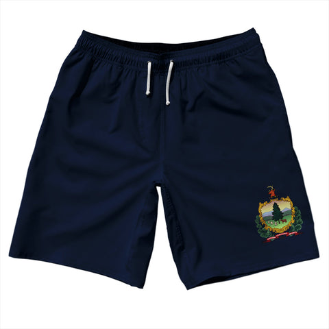 Product Story: Vermont US State Flag Swim Shorts 7" Made in USAProduct Description: Vermont US State Flag Swim Shorts 7" Made in USA Stripe 2.50" Inseam Swim Shorts Swim Trunks Board Shorts Bathing Suits Swim Suits Quick Drying Material Stretch Polyester Elastic Waistband Drawstring Side Pockets Made In USA