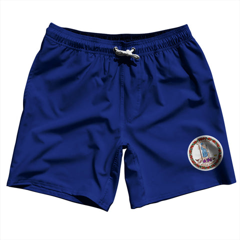 Product Story: Virginia US State Flag Swim Shorts 7" Made in USAProduct Description: Virginia US State Flag Swim Shorts 7" Made in USA 5" Inseam & 17.5" Tall Swim Trunks Board Shorts Bathing Suits Swim Suits Quick Drying Material Stretch Polyester Elastic Waistband Drawstring Side Pockets Made In USA