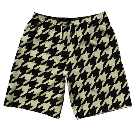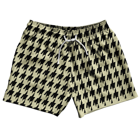 Product Story: Vegas Gold And Black Houndstooth 5" Swim Shorts Made In USAProduct Description: Vegas Gold And Black Houndstooth 5" Swim Shorts Made In USA 5" Inseam & 17.5" Tall Swim Trunks Board Shorts Bathing Suits Swim Suits Quick Drying Material Stretch Polyester Elastic Waistband Drawstring Side Pockets Made In USA