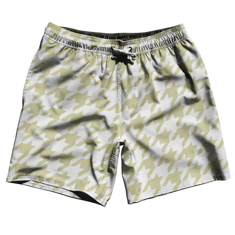 Product Story: Vegas Gold And White Houndstooth Swim Shorts 7" Made In USAProduct Description: Vegas Gold And White Houndstooth Swim Shorts 7" Made In USA 7'' Inseam & 20" Tall Swim Trunks Board Shorts Bathing Suits Swim Suits Quick Drying Material Stretch Polyester Elastic Waistband Drawstring Side Pockets Made In USA