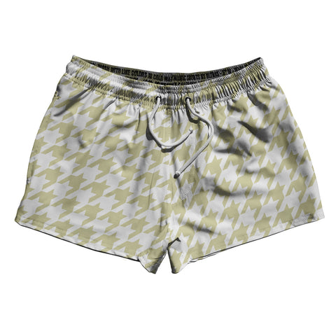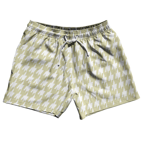 Product Story: Vegas Gold And White Houndstooth 2.5" Swim Shorts Made In USAProduct Description: Vegas Gold And White Houndstooth 2.5" Swim Shorts Made In USA Stripe 2.50" Inseam Swim Shorts Swim Trunks Board Shorts Bathing Suits Swim Suits Quick Drying Material Stretch Polyester Elastic Waistband Drawstring Side Pockets Made In USA
