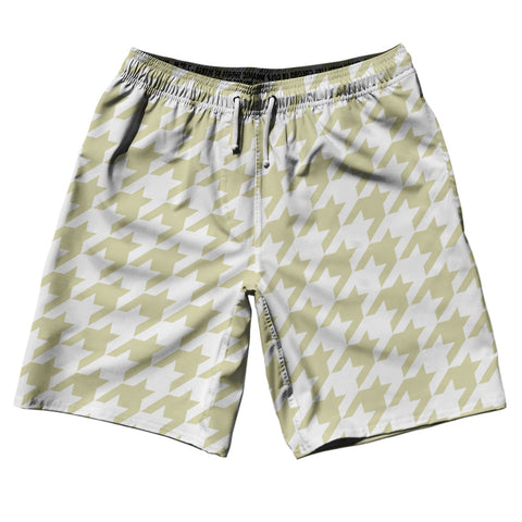 Product Story: Vegas Gold And White Houndstooth 10" Swim Shorts Made In USAProduct Description: Vegas Gold And White Houndstooth 10" Swim Shorts Made In USA Stripe 10" Inseam Swim Shorts Swim Trunks Board Shorts Bathing Suits Swim Suits Quick Drying Material Stretch Polyester Elastic Waistband Drawstring Side Pockets Made In USA