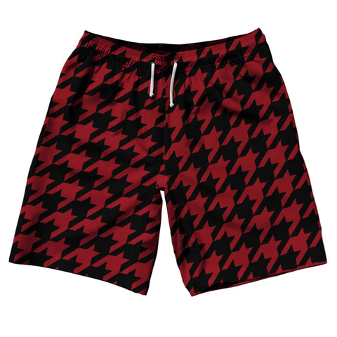 Product Story: Red Cardinal And Black Houndstooth 10" Swim Shorts Made In USAProduct Description: Red Cardinal And Black Houndstooth 10" Swim Shorts Made In USA Stripe 10" Inseam Swim Shorts Swim Trunks Board Shorts Bathing Suits Swim Suits Quick Drying Material Stretch Polyester Elastic Waistband Drawstring Side Pockets Made In USA