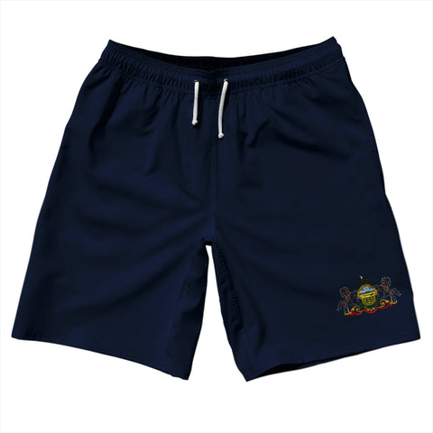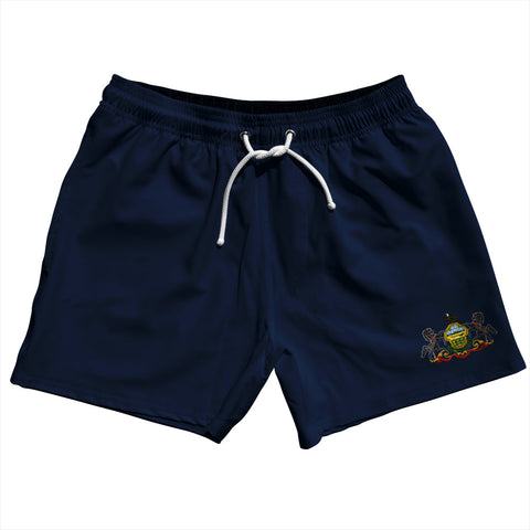 Product Story: Pennsylvania US State Flag 5" Swim Shorts Made in USAProduct Description: Pennsylvania US State Flag 5" Swim Shorts Made in USA 5" Inseam & 17.5" Tall Swim Trunks Board Shorts Bathing Suits Swim Suits Quick Drying Material Stretch Polyester Elastic Waistband Drawstring Side Pockets Made In USA