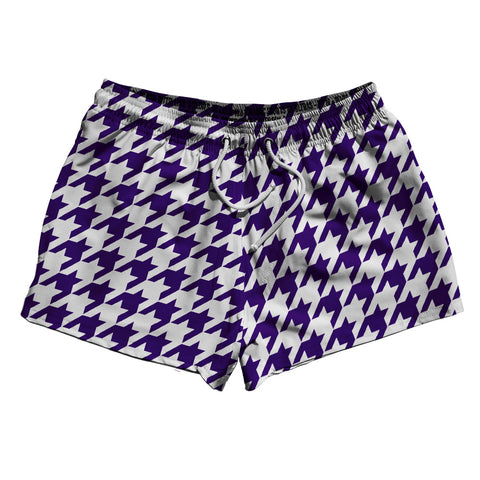 Product Story: Purple Medium And Black Houndstooth 2.5" Swim Shorts Made In USAProduct Description: Purple Medium And Black Houndstooth 2.5" Swim Shorts Made In USA Stripe 2.50" Inseam Swim Shorts Swim Trunks Board Shorts Bathing Suits Swim Suits Quick Drying Material Stretch Polyester Elastic Waistband Drawstring Side Pockets Made In USA