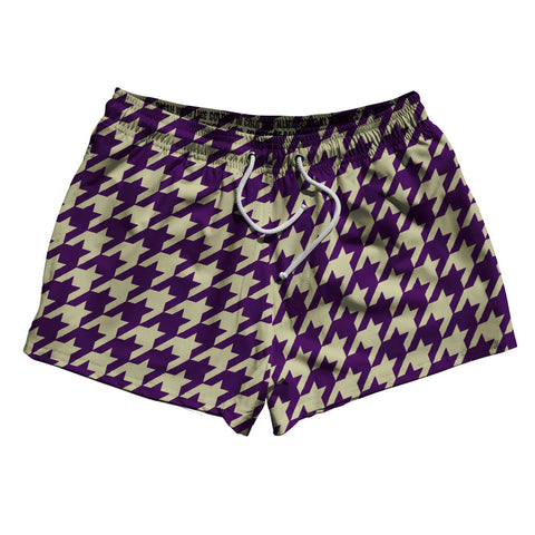 Product Story: Purple Medium And Vegas Gold Houndstooth 2.5" Swim Shorts Made In USAProduct Description: Purple Medium And Vegas Gold Houndstooth 2.5" Swim Shorts Made In USA Stripe 2.50" Inseam Swim Shorts Swim Trunks Board Shorts Bathing Suits Swim Suits Quick Drying Material Stretch Polyester Elastic Waistband Drawstring Side Pockets Made In USA