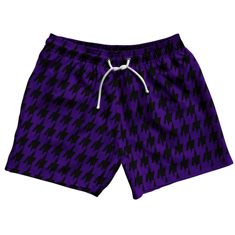 Product Story: Purple Lakers And Black Houndstooth 5" Swim Shorts Made In USAProduct Description: Purple Lakers And Black Houndstooth 5" Swim Shorts Made In USA 5" Inseam & 17.5" Tall Swim Trunks Board Shorts Bathing Suits Swim Suits Quick Drying Material Stretch Polyester Elastic Waistband Drawstring Side Pockets Made In USA
